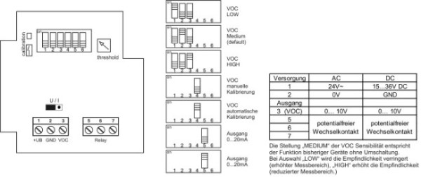 Zur quantitativen Ermittlung und Bewertung der Luftqualität bzw. der Raumluftbelastung mit verunreinigenden Gasen wie Atemluft, Tabakrauch, Lösemitteldämpfen und Automobil-Abgasen bei der bedarfsabhängigen Belüftung in Wohn- und Geschäftsräumen, in Tagungsräumen, Hotels oder Gaststätten. Die von dem VOC-Sensor (Volatile Organic Compounds) erfasste Luft wird in ein Normsignal umgewandelt, wobei ein minimaler Wert am Ausgang als saubere Luft und ein maximaler Wert als stark verunreinigte Luft ausgewertet wird. Die Ausführung mit zusätzlichem Schaltausgang ist werkseitig auf 70% des maximalen Ausgangswertes voreingestellt. Dieser Wert lässt sich intern an die individuellen Belegungs- und Nutzungsverhältnisse der Räumlichkeiten anpassen.